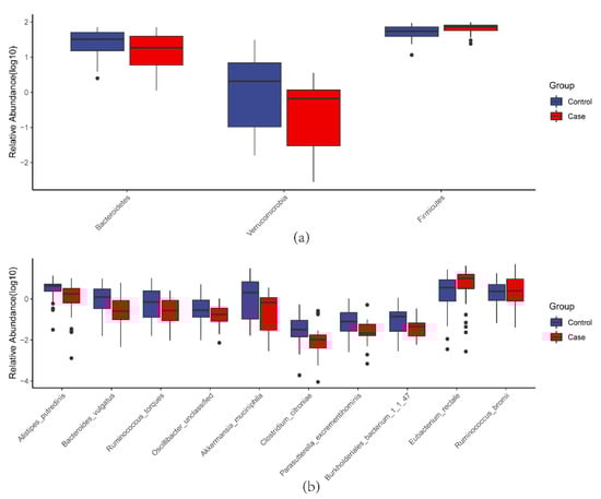 Boxplot of different microbial taxa. (a) Different phylum level taxa in two groups. (b) Different species level taxa in two groups.