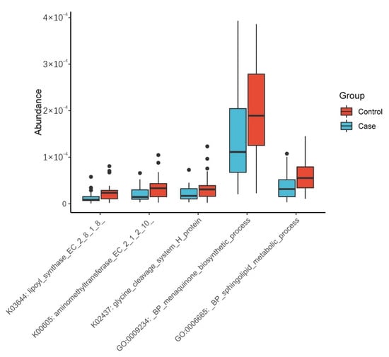 The transcriptome information of samples was compared with KO and GO standard libraries to explore the potential function and mechanism of the gut microbiome in the occurrence of PIH. The preliminary screening of different functions was conducted according to “p < 0.01”, then through literature review, related functions were chosen and visually presented in a heatmap. As shown in Figure 4, PIH patients had significantly lower levels in five functions. (The functional alteration between three groups is showed in Figure S3).