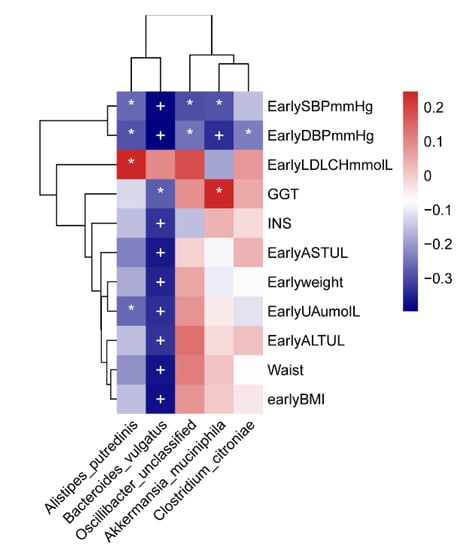 Heatmap of Spearman correlation between different species and clinical indices between case and control groups. Positive correlations are indicated in red text and negative correlations are indicated in blue text. (* p < 0.05; + p < 0.01). SBP, systolic blood pressure; DBP, diastolic blood pressure; LDLCH, low density lipoprotein cholesterol; GGT, glutamyltransferase; INS, insulin; AST, glutamic oxalacetic transaminase; UA, uric acid; ALT, glutamic pyruvic transaminase.