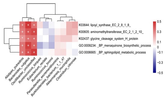 Heatmap of Spearman correlation between different species and function modules between case and control groups. Positive correlations are indicated in red text and negative correlations are indicated in blue text. (* p < 0.05; + p < 0.01).