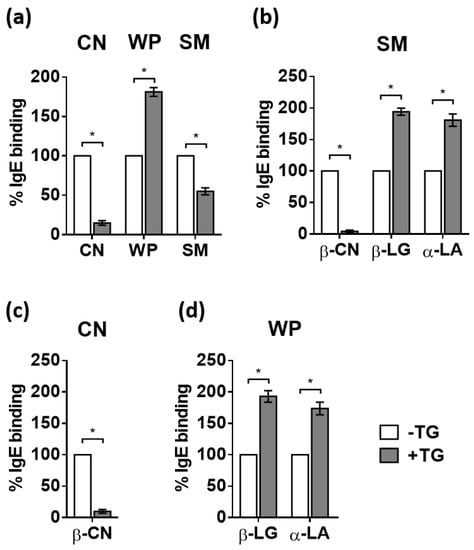 The contribution of individual milk proteins to the binding of IgE capacity to SM, CN, and WP was assessed by inhibition ELISA pre-coating the plates with either β-CN, β-Lg, or α-la. In SM, the binding of IgE to β-CN was greatly reduced after treatment with TG to 3% of the IgE binding to β-CN in the untreated sample (Figure 2b). However, the specific IgE binding to β-LG and α-LA increased to 194% and 181%, respectively. This is consistent with the data obtained when specific inhibition ELISA was performed on CN and WP samples (Figure 2c,d). Different results were found by Fotschki et al., who showed that polymerization with TG decreased β-LG immunoreactivity and increased IgE binding of α-CN [20]. However, they used polyclonal rabbit antibodies, obtained from rabbits immunized against commercial purified allergens instead of human sera from naturally sensitized allergic patients. Villas-Boas et al. [19] also showed that TG crosslinking decreased the potential antigenicity of β-LG by modifying or hiding epitopes, although cross-linking was performed in the presence of cysteine.