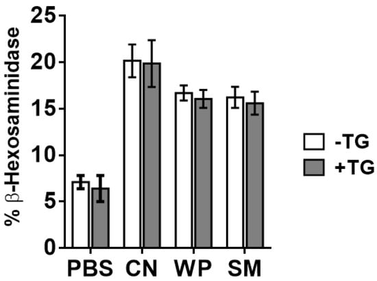 Because mast cells are the main effector cells of the allergic response, we assessed the ability of TG-treated SM, CN, and WP to activate them through an IgE dependent pathway using BM-MCs (Figure 3). Cells were primed with sera from mice sensitized to SM, CN or WP and then treated with specific antigens or PBS. No differences were observed in the percentage of β-hexosaminidase released by BM-MC after incubation with TG-treated SM, CN, and WP compared to cells stimulated with the untreated proteins. To rule out that cell activation occurred through a non-IgE-mediated pathway, we confirmed that neither the protein samples treated with TG nor TG alone induced degranulation in non-sensitized cells. These data would indicate that, although the IgE-binding capacity of milk proteins is affected by the action of TG, the effector cellular response may not be altered. A similar behavior was observed by Nakamura et al. [28], who observed a pronounced increase in the IgE reactivity of a hydrolyzed wheat protein treated with TG without affecting the IgE response of patients with wheat allergy.