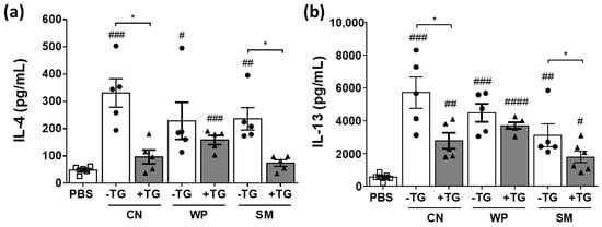 Stimulation of splenocytes. Th2 cytokines (a) IL-4 and (b) IL-13 released from cultures of spleen cells from casein (CN), whey protein (WP), and skim milk (SM) sensitized BALB/c mice (n = 5) stimulated with CN, WP, and SM, either untreated (white bars) or treated with TG (grey bars). Pounds and asterisks indicate, respectively, statistically significant differences with respect to cells stimulated with PBS or between both experimental groups. Data are expressed as mean ± SEM. # and * p < 0.05, ## p < 0.01, ### p < 0.001, #### p < 0.0001.