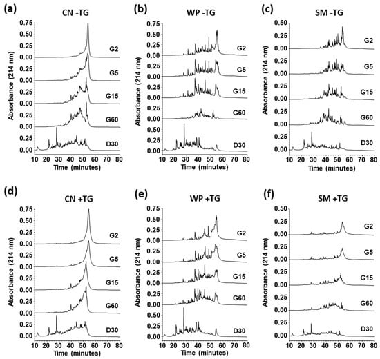 Digestibility of TG cross-linked milk proteins. RP-HPLC patterns of untreated (−TG; a–c) and TG cross-linked (+TG; d–f) casein (CN; a,d), whey proteins (WP; b,e), and skim milk (SM; c,f), after 2 (G2), 5 (G5), 15 (G15), and 60 (G60) min of simulated gastric digestion with pepsin, and subsequent duodenal digestion with Corolase PP for 30 min (D30).