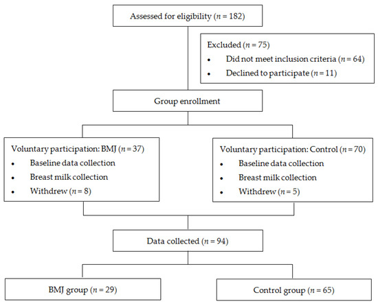 The concentrations of protein, fat, lactose, minerals, water, density, and energy in breast milk were not significantly different between the BMJ and control groups (p > 0.05) (Table 3).