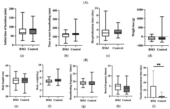 (A) Feeding status during hospitalization, (a) initial time of lactation, (b) time to start breastfeeding, (c) hospitalization time, (d) weight loss. Error bars represent standard errors. (B) Status of growth and feeding of 42-day infants, (e) body length, (f) body weight, (g) breastfeeding frequency, (h) bowel frequency, (i) vaccine postponement time. Error bars represent standard errors. ** indicates p < 0.001.
