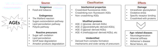 Advanced glycation end products (AGEs) are complex heterogeneous molecules formed by the non-enzymatic reaction between reducing sugars (including fructose and glucose) and proteins, lipids, or nucleic acids with subsequent chemical rearrangements resulting in protein crosslinking, browning, and fluorescence []. AGEs can be crosslinked through side chains to form a substance of very high molecular weight, which is not easily degraded. Many cells have AGEs receptors on the surface, such as macrophages, mesangial cells, fibroblasts, and endothelial cells, through which their function can be affected. AGEs are ubiquitous in humans and accumulate widely in tissues with normal aging. They trigger inflammatory pathways by forming crosslinks, altering protein structure, or by binding to AGEs receptors. AGEs can lead to aging at high concentrations []. They are known to also be associated with age-related diseases, such as diabetes, atherosclerosis, renal failure (uremia) [], kidney disease [], age-related macular degeneration [], aging phenotype, and Alzheimer’s disease []. Different aspects of AGEs are summarized in Figure 1.