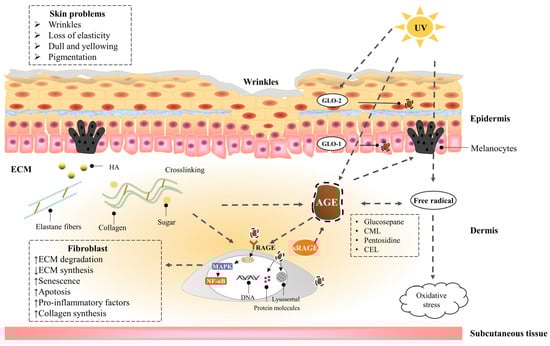 The epidermis is the outermost layer of the skin, which has a protective function that prevents the penetration of pathogens and regulates the body’s water loss [] and provides a natural “shield” against DNA damage []. Keratinocytes are the main cells in the human epidermis, which rapidly differentiate into four layers after proliferation: stratum corneum, stratum granulosum, stratum spinosum, and stratum basale. Protein turnover in the epidermis is much faster, but the accumulation of AGEs can still be observed for a short term before being replaced. mRAGE expression dominates the keratinocytes of healthy human epidermis and can monitor and respond to acute and cellular responses to maintain skin homeostasis []. The presence of RAGE suggests that AGE-mediated activation can have potentially negative consequences even for a short period of time. AGEs have been found to inhibit wound healing in diabetic patients by modulating the expression of MMP-9 in keratinocytes through the RAGE, ERK1/2, and p38 MAPK pathways [] and inducing apoptosis and inhibiting normal cell growth by activating NF-κB [].