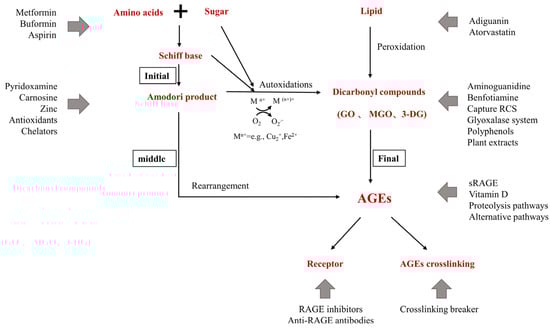 AGEs inhibitors are mainly divided into five categories: (1) carbonyl trapping agents that weaken carbonyl stress; (2) metal-ion chelators or scavenging free radicals, inhibiting sugar and lipid oxidation reaction; (3) crosslinking breakers that reverse AGEs crosslinking; (4) activating the anti-glycation system—many kinds of herbal extracts and natural compounds inhibit glycation by enhancing the anti-glycation system in the body; (5) RAGE antagonists. These include: anti-RAGE antibodies, sRAGE, and RAGE inhibitors; FPSZM1, a specific and potent chemical inhibitor of AGE receptor, which could improve diabetic nephropathy [] and Aβ-mediated brain disorder []; Azeliragon, an oral small molecule antagonist of RAGE in Phase 3 development for mild cognitive impairment []. Small molecules are also in development to inhibit Diaphanous.1, the intracellular RAGE adaptor []. Inhibiting oxidative stress and inflammation in tissues by blocking the interaction of AGEs with RAGE is another new way to inhibit the process of late glycation. Figure 4 shows the action sites that inhibit the formation of AGEs in vivo.