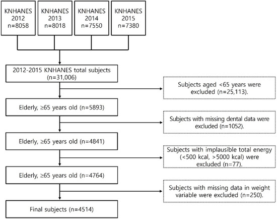 This study selected elderly people over 65 years old who participated in the nutritional survey and health interview of the KNHANES 2012–2015. To examine the intake of plant food (fruit and non-starchy vegetable) of these subjects, adults who were 65 y of age or older who participated in the 24 h recall method were first selected as subjects (5893 persons). Some of the subjects who consumed less than 500 kcal or more than 5000 kcal (77 persons) were excluded. Outlier data on subjects who did not participate in the dietary survey (24 h recall survey) were also excluded (250 persons). A total of 4514 people were selected in the study (Figure 1). The KNHANES data used in this study were approved by the KDCA Institutional Review Board (IRB approval numbers: 2012-01EXP-01-2C, 20N-03-4C, and 2013-12EXP-03-5C). Among these, the KNHANES was exempt from review regarding research ethics based on the Bioethics and Safety Act from 2015 to 2017 [25].