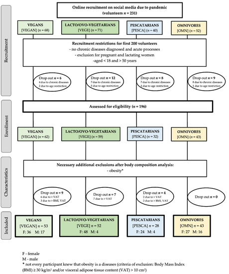 Finally, 20 participants were excluded (9 vegans, 7 lacto/ovo-vegetarians, 4 pescatarians) due to incorrect body composition, indicating obesity. Ultimately, the number of respondents was 176. The recruitment scheme of the respondents is presented in Figure 1.