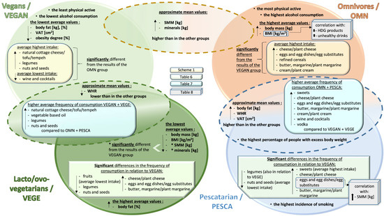 The obtained results, showing the significance of the differences, confirmed the previously observed (based on average values) dependencies concerning the increased consumption in groups, including the consumption of meat, products such as sweets, cheese, butter, cream, and alcoholic beverages) than in the other groups; moreover, they showed increased consumption of eggs. The group VEGE + VEGAN revealed significantly more frequent consumption of products, such as natural cottage cheese/tofu/tempeh, vegetable oils, legumes, nuts and seeds, if compared to OMN + PESCA.