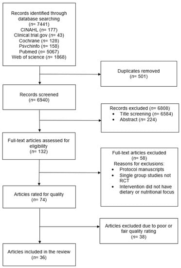 A total of 7441 articles were identified through the database search. After the removal of duplicates, 6940 articles were screened. A tertiary screening approach was utilized, whereby abstracts were first screened based on inclusion and exclusion criteria via a review of titles (n = 6584 excluded), then a review of abstracts (n = 224 excluded). The remaining n = 132 articles were read entirely to review whether they met the inclusion and exclusion criteria (n = 40 excluded). A total of n = 74 articles were rated on quality using the NHLBI Quality Assessment of Controlled Intervention Studies quality scoring tool (described above). Thirty-eight articles were excluded for a poor or fair quality rating, resulting in a total of n = 36 research articles included in the current systematic review. In four instances, two research articles were longer-term follow-up results of another included research article. Therefore, a total of 31 independent research studies were examined in the current systematic review. See Figure 1 for the PRISMA diagram.