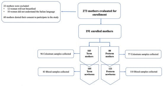 During the study period, from August to November 2021, 293 women met the inclusion criteria. A total of 60 women denied their consent to the study while 22 were excluded for their lack of understanding the Italian language or because they would not breastfeed. A total of 191 women were divided as follows: 103 mothers that gave birth at term and 88 that had preterm births. The study’s flow chart is shown in Figure 1.