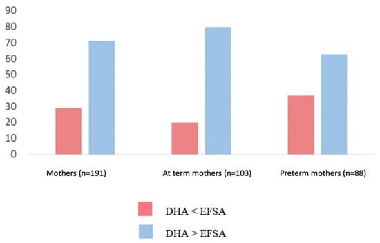 Percentage of preterm and term mothers whose DHA intake was either < lower or higher than EFSA recommendations [16].