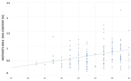 Relationship between mother’s milk DHA’s content (%) and gestational age (weeks).