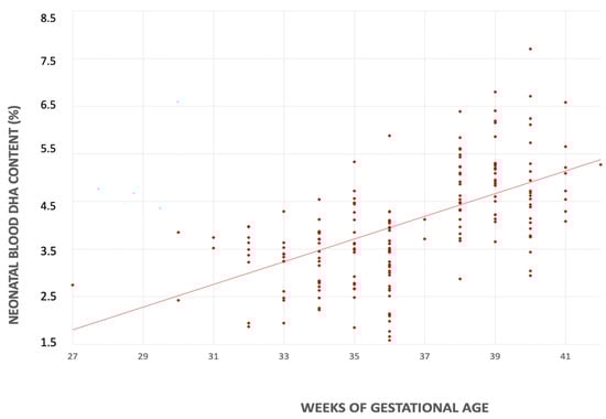 In the univariate linear regression analyses, for each additional week of gestational age there was an increase in the DHA content in both mother’s milk (0.044% FA; CI 95% 0.020–0.069 p < 0.001) and neonatal blood (0.239% FA; CI 95% 0.151–0.325, p < 0.001) (Figure 3 and Figure 4).