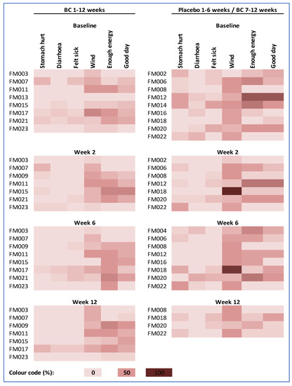 Symptoms and well-being recorded by seven-day diaries at recruitment and during weeks 2, 6 and 12 were broadly similar in the two groups (Figure 2). Wind and lacking energy were the most commonly reported symptoms, and these tended to persist in both study arms. The lack of diary data for weeks 7–12 in the placebo group reflects the greater withdrawals in children who switched from placebo to BC.