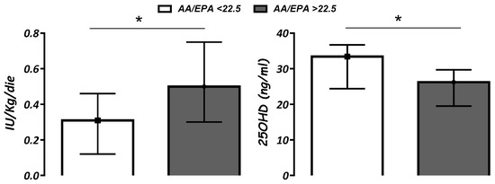 Insulin requirement (IU/Kg/day) and serum vitamin D (25OHD; ng/mL) levels according to AA/EPA ratio below or above 22.5 (1st quartile). Data are expressed as median (IQR). * p < 0.05.