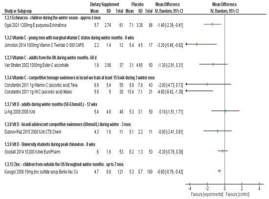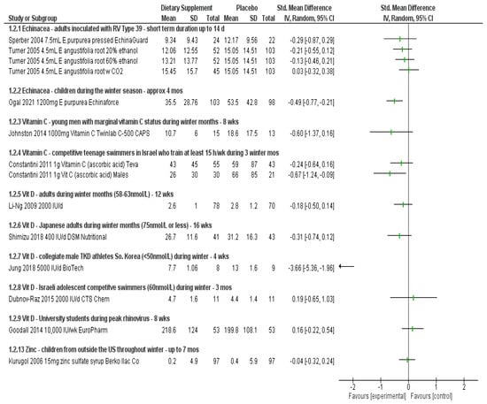 | 1 child study (n = 203) [15] During winter time season | RR 0.70 (95% CI, 0.52, 0.95; p = 0.023); up to 30% less risk when taking Echinacea | SMD −0.49 (95% CI, −0.77, −0.21; p = 0.001) | MD −1.4 days (95% CI, −2.39, −0.41; p = 0.008) | RD 0.04 (95% CI, −0.10, 0.17; p = 0.61, N = 1) | |
