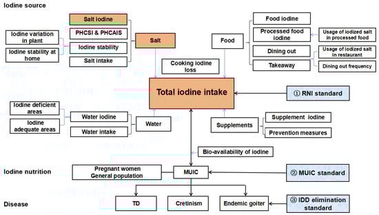 Iodine is an element necessary for the production of thyroid hormones and plays a major role in the growth and development of tissue [1]. A lack of iodine can lead to a spectrum of growth, developmental, and functional morbidities across the whole life span, which are known as iodine deficiency disorders [2]. The consequences of severe iodine deficiency are not only endemic goiter, but also hypothyroidism, cretinism, and decreased fertility rates, etc. [3]. Owing to the high prevalence of iodine deficiency disorders worldwide, ensuring appropriate iodine nutrition for the population and eliminating iodine deficiency disorders is vital for almost all countries.