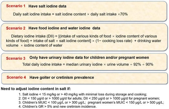Based on each country’s surveillance data, different plans for managing iodine content in salt can be proposed (Figure 3). However, iodine content in salt should not be lower or higher than the recommended range of 15–40 mg/kg if iodine loss is reasonable. Otherwise, iodine deficiency or excess will emerge [30].