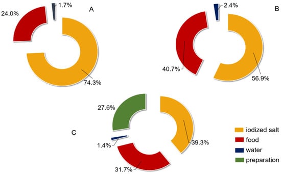 Contribution of iodine from different sources for different populations. (A) children; (B) adults; (C) pregnant women.