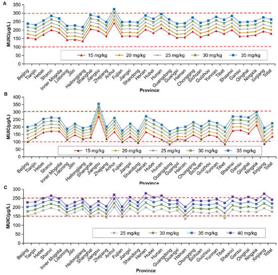 The data were evaluated according to median urinary iodine concentration. Based on the salt consumption in each province and the urine iodine concentration in 2020 China National Iodine Deficiency Disorders Surveillance data, each province was able to select their own iodine content in salt from the preset iodine content, and for the general population, when different iodine contents in salt were taken (20, 25, 30 mg/kg, plus lower and upper variation limits, 15 and 35 mg/kg), the median urinary iodine concentrations reached sufficient levels; and for pregnant women, when different iodine contents in salt were taken (2 contents, 30, 35 mg/kg, plus lower and upper variation limits, 25 and 40 mg/kg), the median urinary iodine concentrations reached sufficient levels (Figure 5).