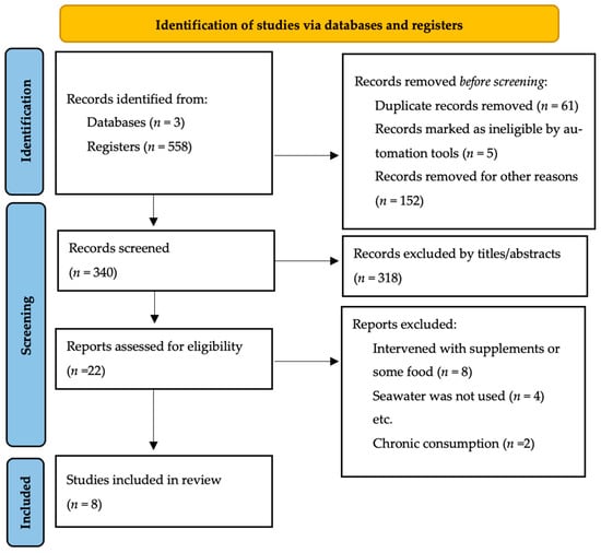 Based on the Preferred Reporting Items for Systematic Reviews and Meta-Analyses (PRISMA) guidelines [27], this systematic review was conducted. An exhaustive bibliographic search was conducted in three databases (Web of Science, PubMed, and Scopus), from 1 January 2000 to 31 July 2022. As there has been no systematic review of seawater consumption in endurance events, we have set the starting year as 2000 in order to identify as many studies from the last 22 years as possible. A search strategy for Web of Science, PubMed, and Scopus is shown in Table 1. This systematic review was listed on the PROSPERO (International prospective register of systematic reviews) website on 9 July 2022, with the following record CRD42022341587. Available from: https://www.crd.york.ac.uk/prospero/display_record.php?ID=CRD42022341587 (accessed on 30 August 2022).
