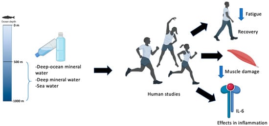Although water is sufficient to rehydrate after short-term acute effort, in the case of endurance events, it may be insufficient and should be supplemented with the consumption of some type of meal that restores the loss of electrolytes. Indeed, such long-duration events generate large sweat losses, which induce significant salt elimination. Therefore, a rehydration program should be undertaken to restore electrolyte losses, leading to adequate recovery [13]. Stasiule et al. [11] reported that ingestion of deep mineral water could accelerate the recovery of aerobic capacity and leg muscle power compared with the ingestion of water alone [11]. In addition, it has been shown that desalinated ocean mineral water, taken from 662 m below sea level, can substantially accelerate the recovery of aerobic capacity and lower-body muscle power after a prolonged bout of dehydrating exercise [12]. DSW is mainly characterized by a high percentage of minerals such as magnesium (Mg). Indeed, Mg deficiency may potentiate exercise-induced muscle damage and stress, as well as exacerbate inflammation through an increase in the secretion of pro-inflammatory cytokines [14,15,16]. However, the evidence for the beneficial effects of DSW is still limited. This is because it has not been thoroughly evaluated in endurance sports, such as the triathlon, with the compounding factor that it has limited access to liquids.