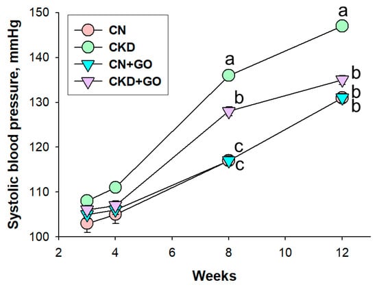 Effect of perinatal garlic oil supplementation on systolic blood pressure in offspring at 3–12 weeks of age. The letters a, b and c indicate the differences between the groups (p < 0.05, two-way ANOVA); N = 8/group.