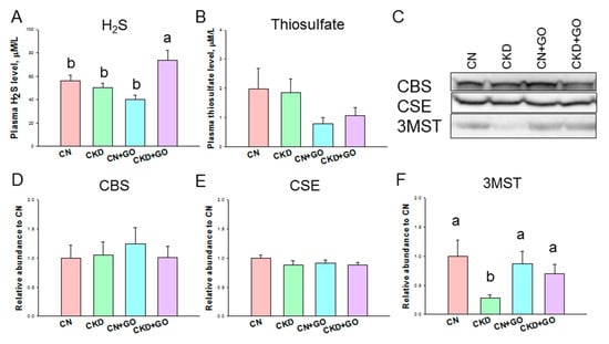 Figure 2 illustrates the H2S pathway, which includes plasma H2S and thiosulfate levels and protein levels of H2S-producing enzymes in offspring kidneys. The plasma H2S level was higher in the CKD+GO group compared to the three other groups (Figure 2A), whereas the plasma thiosulfate level was comparable among the four groups (Figure 2B). Renal protein abundance of H2S-producing enzymes CBS, CSE, and 3MST is compared in Figure 2C. Garlic oil supplementation has a negligible effect on renal CBE and CSE abundance (Figure 2D,E). Maternal CKD led to a reduction in the renal 3MST protein level, which garlic oil supplementation prevented (Figure 2F). Together, these findings show that garlic oil treatment increases plasma H2S and the renal 3MST protein level.