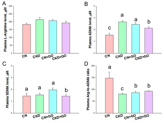 Compared to the CN+GO group, the plasma SDMA level was lower in the CKD+GO group (Figure 3C). Additionally, CKD reduced the L-arginine-to-ADMA ratio, an index of NO bioavailability [], in the CKD group (Figure 3D). In contrast, the decreased L-arginine-to-ADMA ratio was improved by garlic oil supplementation.