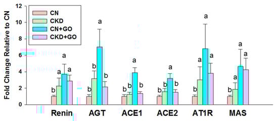As aberrant activation of the RAAS participates in hypertension of developmental origins [], we then looked at the renal mRNA expression of RAAS components. Compared to the CN group, renal mRNA expression of renin, AGT, ACE1, ACE2, AT1R, and MAS was higher in the CN+GO group (Figure 4). That is, two axes of RAAS—classical axis (ACE1/Angiotensin II) and nonclassical axis (ACE2/Ang-(1–7))—are both activated by perinatal garlic oil treatment. Additionally, garlic oil supplementation enhanced AT1R and MAS expression in the offspring kidneys of the CKD+GO group vs. the CKD group. It is known that activating AT1R promotes vasoconstriction, while agonizing MAS in favor of vasodilatation. As the two RAAS axes act in an opposite manner, our data suggest that the RAAS may not be the primary mechanism behind the protective effect of garlic oil on maternal CKD-induced hypertension.