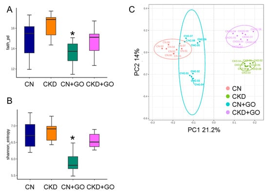 We first analyzed α- and β-diversity metrics to elucidate how maternal CKD and perinatal garlic oil supplementation influence the establishment of gut microbiota in adult offspring. Community richness and evenness were estimated by Faith’s PD index and the Shannon index, respectively. We found maternal CKD has a negligible effect on both α-diversity metrics, while these metrics were lower in the CN+GO group than those in the CN group (Figure 5A,B). PCoA plots of β-diversity based on the unweighted UniFrac metric were utilized to illuminate the samples clustered according to study groups, as shown in Figure 5C. We observed from ANOSIM that there were significant differences in the groups (all p < 0.05). Our data reveal that perinatal garlic oil supplementation caused offspring gut microbiota shifts in diversity. Regarding the composition, the predominant phyla are Firmicutes and Bacteroidetes, followed by Actinobacteria, Deferribacteres, and Proteobacteria; these results are consistent with prior animal studies that showed gut microbiota are dominated by these bacteria [,,].