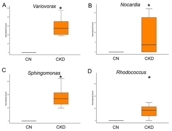 Effect of maternal CKD on the gut microbiota in 12-week-old male offspring. Genus-level relative abundance of (A) Variovorax, (B) Nocardia, (C) Sphingomonas, and (D) Rhodococcus. * p < 0.05.