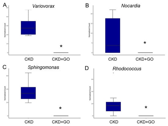 Effect of perinatal garlic oil on the gut microbiota of CKD+GO group compared to the CKD group. Genus-level relative abundance of (A) Variovorax, (B) Nocardia, (C) Sphingomonas, and (D) Rhodococcus. * p < 0.05.