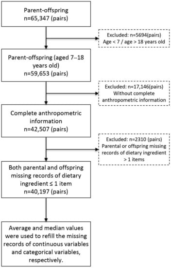 This is a re-analysis from a previous database, which was collected from a national cross-sectional study in China from seven provinces in 2013 []. More detailed information about this study was presented elsewhere []. Briefly, we used a multistage cluster random sampling to choose participants in national seven provinces. Several regions were randomly included in every province at the beginning. Then, 12–16 schools were randomly selected in each region. Two classes in every grade from each school were subsequently chosen at random, and their parents were also invited to engage in this survey. A total of 65,347 children and adolescents were included in the study. We chose 59,653 of the children aged between 7–18 years old, which is an age range with a high waist circumference screening threshold among children and adolescents in China. Anthropometric information was taken from 42,507 parent–offspring pairs. After removing participants who had more than one missing item from the group of dietary behaviors, a total of 40,197 children and adolescents remained in the final analysis, together with their parents (Figure 1).