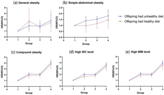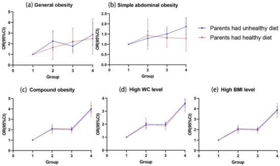 We then assessed the relationship of OW/OB between two generations divided by parental dietary behaviors. Similarly, the results showed that parental OW/OB was associated with an increased risk of offspring’s multiple obesity, whether parents had healthy dietary behaviors or not. When parents had unhealthy dietary habits, the ORs (95% CI) of general obesity was 2.73 (1.88–3.79) in offspring with both parental OW/OB, higher than 1.73 (1.31–2.28) and 2.14 (1.42–3.22) in offspring with only paternal or maternal OW/OB. The same results could be observed in simple abdominal obesity, compound obesity, a high WC level, and a high BMI level. Among offspring whose parents had healthy dietary behaviors, parental OW/OB was associated with a higher risk of all types of obesity in the offspring. The exception was for simple abdominal obesity, in which ORs (95% CI) were non-significant (1.17 (0.67–2.03), 1.26 (0.85–1.86) and 1.30 (0.76–2.23) in offspring with both parental OW/OB, only paternal OW/OB, and only maternal OW/OB, respectively) (Figure 2, Supplementary Table S6).