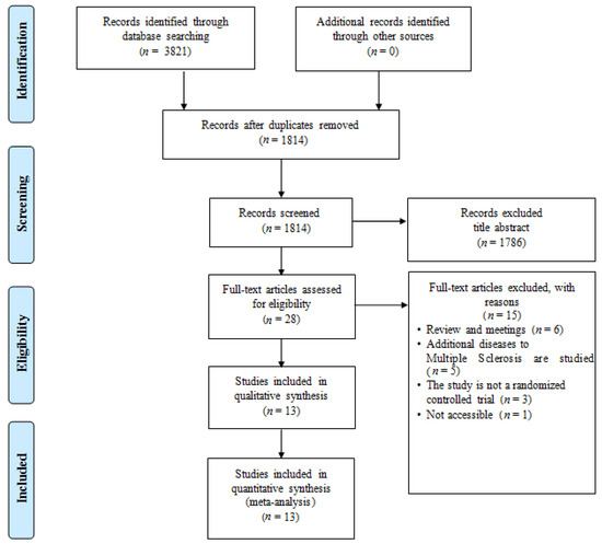 Figure 1 shows the search results and a flowchart of the study selection [10,11,19,33,34,35,36,37,38,39,40,41,42]. The initial literature search yielded a total of 1814 records after duplicate exclusion. After reviewing the full text, 1786 articles were further excluded. Finally, 13 studies with 1353 participants were included in this study. All the included studies were published as full manuscripts.