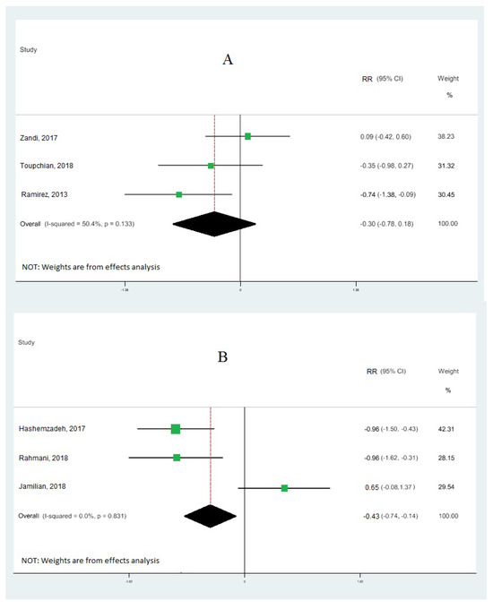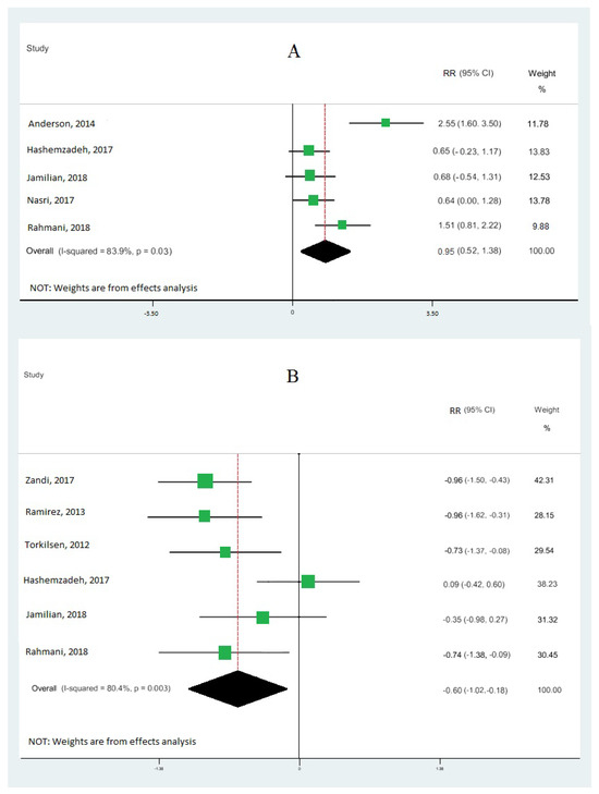 Forest plot of the highest vs. lowest meta-analysis of omega-3 effects on gene expression of inflammation: interleukin-6 (A) and interleukin-8 (B). RR and 95% CI are abbreviations of the relative risk and 95% confidence interval, respectively [19,33,34,36,38,39].