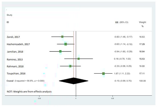 Forest plot of the highest vs. lowest meta-analysis of omega-3 effects on gene expression of inflammation: tumor necrosis factor-alpha (TNF-α). RR and 95% CI are abbreviations of the relative risk and 95% confidence interval, respectively [19,33,34,36,38,39].