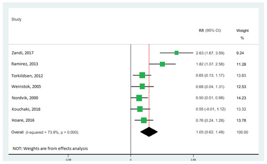 Forest plot of the highest vs. lowest meta-analysis of docosahexaenoic acid (DHA) effects on Expanded Disability Status Scale (EDSS) score. RR and 95% CI are abbreviations of the relative risk and 95% confidence interval, respectively [10,11,33,34,40,41,42].