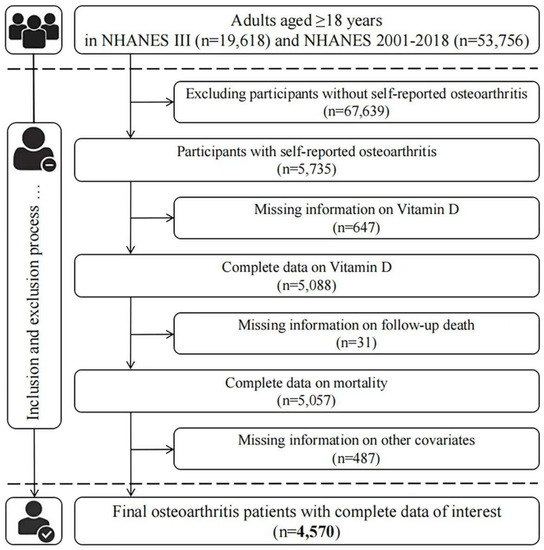 Here, the data from NHANES III (from 1988 to 1994) and NHANES 2001–2018 were used in our analysis, and only respondents (aged > 18 years) with self-reported OA were included in our analysis. OA patients were identified by answering “Yes” to the question “Has a doctor ever told you that you had arthritis?” and then selecting “Osteoarthritis” to the question “Which type of arthritis was it?”. As a common chronic disease, self-reported information was considered to be reliable in most instances; an 85% concordance between self-reported OA and clinically well-defined OA was exhibited in a previous study [13]. At first, 5735 OA patients were identified. After excluding those who did not have 25(OH)D concentrations measurements (647), mortality (31), or other relevant covariates (487), 4570 individuals were eventually included in our study (Figure 1).