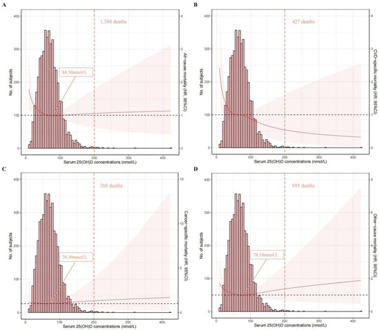 Spline analyses of all-cause (A), CVD-specific (B), cancer-specific (C), and other-cause (D) mortality according to serum 25(OH)D concentrations, with the frequency distribution histogram in the background. Solid red lines represent multivariable-adjusted hazard ratios, with light-red areas showing the 95% confidence intervals derived from restricted cubic spline regressions (spline analyses were adjusted for age, gender, race/ethnicity, education, body mass index, physical activity, smoking status, drinking status, diabetes mellitus, hypertension, cardiovascular disease, cancer, chronic lung disease, and renal disease); arrows indicate the concentration of 25(OH)D with the lowest risk of mortality; over 99% of the participants were located to the left of the red dotted lines.