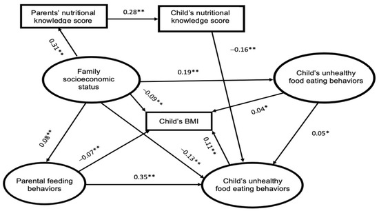 The indirect effect of the family’s socioeconomic status, in regard to parents’ nutrition knowledge, significantly decreased the children’s BMI (model A: −0.0016, p < 0.001; model B: −0.0015, p < 0.001). Moreover, the indirect effect of the family’s socioeconomic status, in terms of parental feeding behaviors, also decreased the children’s BMI (model A: −0.0056, p < 0.001; model B: −0.0056, p < 0.001). In addition, the indirect effect of the family’s socioeconomic status, through the children’s unhealthy-food eating behaviors, reduced the children’s BMI. (model A: −0.014, p < 0.001; model B: −0.014, p < 0.001). However, the indirect effect of the family’s socioeconomic status, through parental feeding behaviors and the children’s unhealthy-food eating behaviors, increased the children’s BMI (model A: 0.0034, p < 0.001; model B: 0.0031, p < 0.001). The indirect effect of the family’s socioeconomic status, in terms of the neighborhood environment, significantly increased the children’s BMI (model B: 0.0076, p < 0.001). Similar results can also be seen in the indirect effect of the family’s socioeconomic status via the neighborhood environment and the children’s unhealthy-food eating behaviors (model B: 0.0076, 0.0001, p < 0.001). Moreover, the indirect effect of parental feeding behaviors, in terms of the children’s unhealthy-food eating, dramatically increased the children’s BMI (model A: 0.042, p < 0.001; model B: 0.0385, p < 0.001). With the exception of the indirect impacts, the parents’ nutritional knowledge, in regard to the children’s nutritional knowledge levels and the children’s unhealthy-food eating behaviors, was found to have a positive impact on reducing the children’s BMI in both models (model A: −0.0054, p < 0.001; model B: −0.0049, p < 0.001). Additionally, the indirect effect of the children’s nutritional knowledge levels, in terms of the children’s unhealthy-food eating behaviors, was also correlated with a decrease in the children’s BMI (model A: −0.0192, p < 0.001; model B: −0.0176, p < 0.001).
