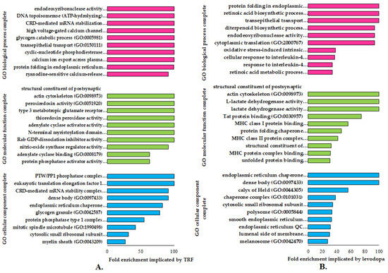 The functional gene ontology (GO) terms of molecular function, biological process and cellular component using PANTHER (version 16) database on differentially regulated proteins (p < 0.05) in (A) TRF and (B) levodopa treatments on diff-neural cells. The horizontal coordinate (x-axis) represents the logarithmic transformation at the base of 10 of the raw p-value, and the vertical (Y-axis) displays the GO term classifications.