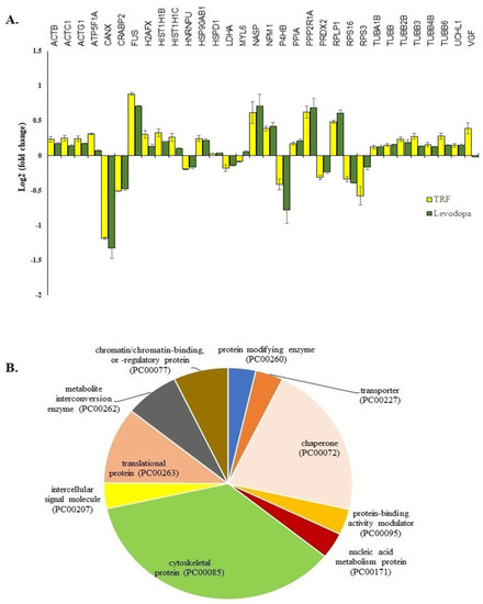The 32 common proteins expressed in TRF and levodopa treated diff-neural cells. (A) Histogram shows the different fold change expressions of the 32 common proteins (p < 0.05) regulated by treatment of levodopa or TRF on diff-neural cells. The horizontal coordinate (x-axis) represents the types of protein, and the vertical coordinate (Y-axis) denotes the difference in fold change (logarithmic transformation at the base of 2). (B) Pie chart shows the classification of 32 proteins into 10 functional categories using PANTHER online database.