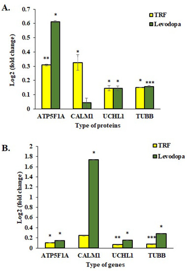In the qPCR assay, TRF upregulated the mRNA expression of ATP5F1A, UCHL1 and TUBB with p < 0.05. However, the CALM1 upregulation by TRF was not statistically significant. Levodopa showed a remarkable overexpression of ATP5F1A, CALM1, UCHL1 and TUBB with p < 0.05 (Figure 6B).