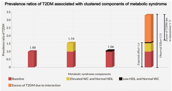 We used Poisson regression models to evaluate both additive and multiplicative interactions among pair-wise clusters of metabolic syndrome components (regarding T2DM) in the stratum formed by at least a third component, thus defining the presence of MetS. For example, when assessing the pair-wise combination of elevated WC and high TG, we examined their 1st order interaction in the stratum formed by high BP or low HDL-c, to meet MetS criteria.
